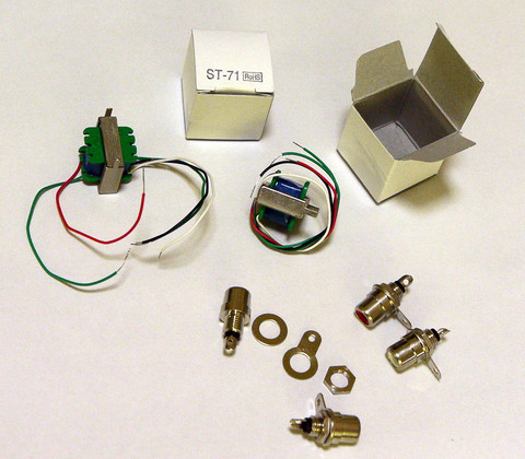 材料。線が出てるやつがトランス。右はRCAピンジャック。合計で1500円弱。