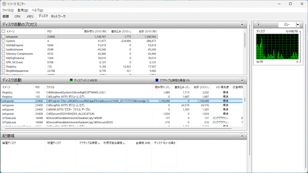 なんか動いてたので、C:\Program Files (x86)\Microsoft\Edge\Temp 以下を消した。なんだろうな。