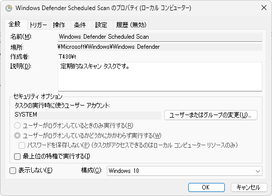 これもタスクスケジューラーから。Microsoft – Windows – Windows Defender とたどって、Schedule Scanのプロパティで「最上位の特権で実行する」のチェックボックスをOFFにする。下の画面はOFFにしたあとだ。